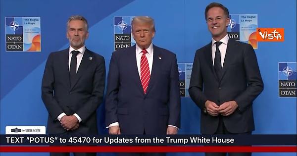 Vertice Nato, Trump si sistema la giacca per la foto di famiglia con Rutte e Schoof