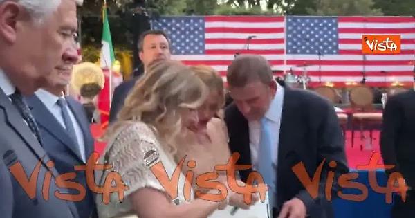 La Presidente del Consiglio Giorgia Meloni a Villa Taverna per la festa dell'Indipendenza Usa che si celebra il 4 luglio. Al termine del suo discorso, ha firmao una copia del suo libro "Io sono Giorgia" per l'Ambasciatore Usa Fertitta.