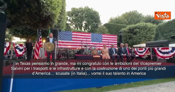 "In Texas pensiamo in grande, ma mi congratulo con le ambizioni del Vicepremier Salvini per i trasporti e le infrastrutture e con la costruzione di uno dei ponti più grandi d’America… scusate (in Italia)... vorrei il suo talento in America", il lapsus dell'ambasciatore Fertitta alla Festa del 4 Luglio a Roma.