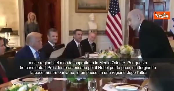 "La visione e la leadership del Presidente Trump hanno promosso una diplomazia innovativa, definita non dal conflitto e dall'estremismo, ma dalla cooperazione, dal dialogo e dalla prosperità condivisa, per costruire la pace in molte regioni del mondo, soprattutto in Medio Oriente. Per questo ho candidato il Presidente americano per il Nobel per la pace, sta forgiando la pace mentre parliamo, in un paese, in una regione dopo l’altra", lo ha detto il premier israeliano Benjamin Netanyahu a cena alla Casa Bianca con Trump.