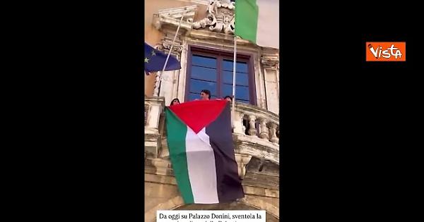 La Presidente della Regione Umbria, Stefania Proietti, espone fuori da Palazzo Donini a Perugia, sede della giunta regionale, la bandiera della Palestina.