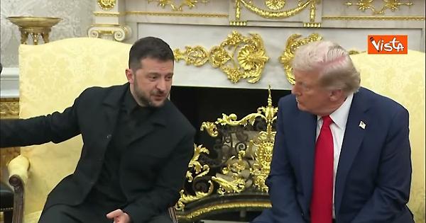 ll Presidente ucraino Volodymyr Zelensky consegna al Presidente statunitense Donald Trump una lettera scritta da sua moglie, Olena Zelenska, per la moglie di Trump, Melania nello studio ovale della Casa Bianca.