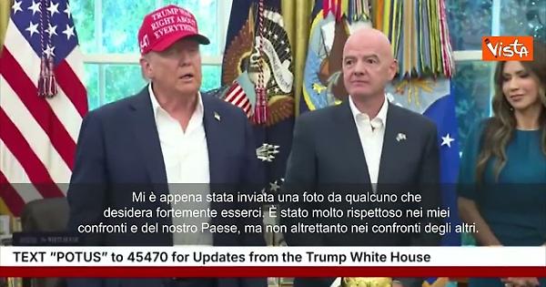 Mi è appena stata inviata una foto da qualcuno che desidera fortemente esserci. È stato molto rispettoso nei miei confronti e del nostro Paese, ma non altrettanto nei confronti degli altri. Firmerò questa foto per lui. È un uomo di nome Vladimir Putin, che credo verrà... dipende da cosa accadrà", così Putin, a fianco di Gianni Infantino nello Studio Ovale della Casa Bianca, mostra la foto di Vladimir Putin con lui in Alaska.