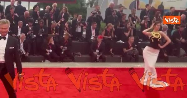 Una modella sfila sul red carpet dell'82esima Mostra del cinema di Venezia con un abito decorato da un originale serpente dorato.