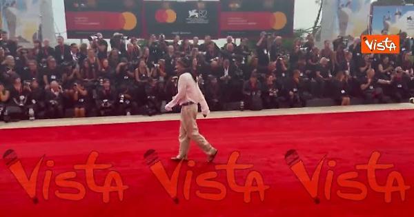 Ecco il look "piratesco" di Stefano Guerrera con bandana leopardata e infradito scelto per il red carpet del film "The Hunt" all'82esima Mostra del Cinema di Venezia.