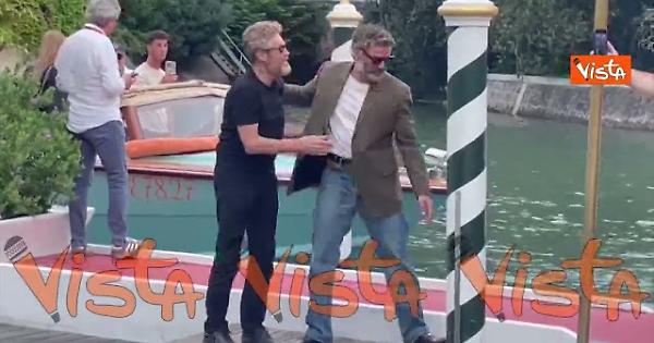 Willem Dafoe e Oscar Isaac si abbracciano e scherzano con i fotografi al Lido di Venezia all'82esima Mostra del Cinema.