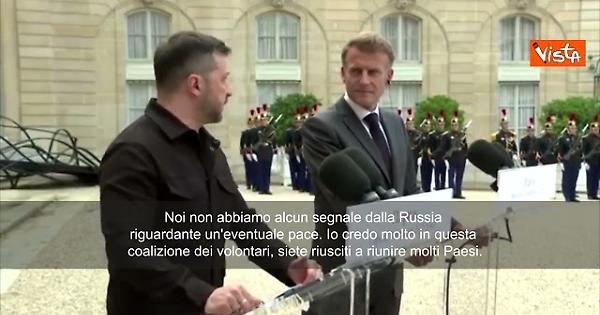 (Agenzia Vista) Parigi, 03 settembre 2025 "Noi non abbiamo alcun segnale dalla Russia riguardante un'eventuale pace. Io credo molto in questa coalizione dei volontari, siete riusciti a riunire molti Paesi". Lo ha detto il presidente ucraino, Volodymyr Zelensky, parlando questa sera al fianco di Emmanuel Macron nel cortile dell'Eliseo. Telegram Fonte: Agenzia Vista / Alexander Jakhnagiev
