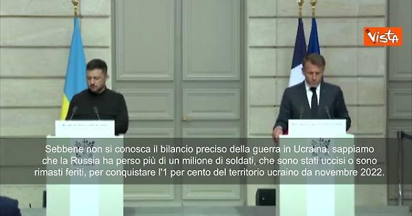 “Sebbene non si conosca il bilancio preciso della guerra in Ucraina, sappiamo che la Russia ha perso più di un milione di soldati, che sono stati uccisi o sono rimasti feriti, per conquistare l'1 per cento del territorio ucraino da novembre 2022. Il problema è Mosca e questa guerra d'aggressione, un' idea immorale, illegale e impossibile. Il fattore preliminare ad ogni discussione sulla pace è la necessità del ritiro immediato delle truppe russe in Ucraina". Lo ha detto il presidente francese Emmanuel Macron al termine della riunione della Coalizione dei volenterosi che si è tenuta all'Eliseo, in conferenza stampa con il presidente ucraino Volodymyr Zelensky.