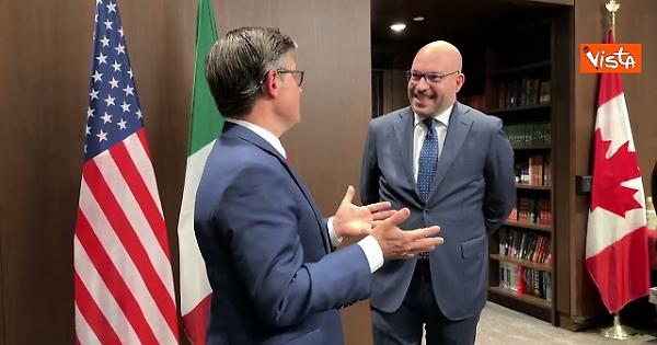 (Agenzia Vista) Roma, 05 settembre 2025 Si è aperta con quattro incontri bilaterali (con i vertici parlamentari di Canada, USA, Ucraina, Parlamento Europeo) la partecipazione del Presidente della Camera Lorenzo Fontana al G7 Parlamentare, a Ottawa, edizione che segue quella a presidenza italiana organizzata a Verona proprio in questi giorni del 2024. Fontana ha incontrato in queste ore gli omologhi del Canada, Francis Scarpaleggia, degli Stati Uniti, Mike Johnson, dell'Ucraina, Ruslan Stefanciuck e del Parlamento Europeo, Roberta Metsola. Al centro i temi della pace, della cooperazione e della diplomazia parlamentare. Al Presidente Johnson, Fontana ha fatto dono di una bottiglia di vino della Valpolicella, ponendo l'accento sul tema dei dazi al comparto e rilanciando il marchio VinitalyIl Presidente della Camera, giunto ieri al Senato canadese, ha firmato il libro d'onore, accolto dallo Speaker Scarpaleggia, a cui ha fatto omaggio di una guida italiana del 1906 della Regione del Vulture, area di nascita del nonno del Presidente, Frank Scarpaleggia, emigrato proprio in quell'anno. Un omaggio simbolico alla storia dell'emigrazione italiana e al contributo offerto dai nostri connazionali alla crescita e allo sviluppo di tanti Paesi. Oggi il Presidente della Camera interverrà come relatore in conferenza sul tema del ruolo dei Parlamenti nel mondo polarizzato. Suoi contributi sono anche previsti in altri panel tematici. Seguiranno inoltre altri incontri bilaterali. Camera Fonte: Agenzia Vista / Alexander Jakhnagiev