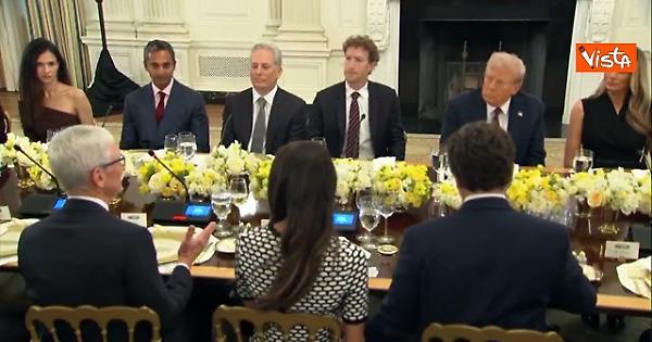 Donald e Melania Trump hanno ricevuto alla Casa Bianca i leader delle Big Tech per parlare di intelligenza artificiale. Presenti tra gli altri, presenti Tim Cook, Bill Gates, Mark Zuckerberg e Safra Catz. Manca Elon Musk, che ha mandato un suo collaboratore.