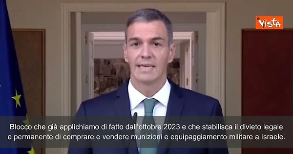 (Agenzia Vista) Madrid, 08 settembre 2025 "Il Governo di Spagna ha deciso di fare un ulteriore passo e di mettere immediatamente in atto azioni aggiuntive per fermare l’aggressione a Gaza, perseguire i suoi esecutori e sostenere la popolazione palestinese. Azioni che desidero condividere con tutti voi. La prima è l’approvazione urgente di un decreto-legge reale che consolidi giuridicamente il blocco del transito di armi verso Israele che già applichiamo di fatto dall’ottobre 2023 e che stabilisca il divieto legale e permanente di comprare e vendere munizioni e equipaggiamento militare a Israele. In secondo luogo, insieme a questo embargo, il divieto di transito, da parte della Spagna o attraverso i porti spagnoli, delle navi che trasportano combustibili destinati alle Forze Armate israeliane" così il primo ministro spagnolo Pedro Sànchez in un messaggio alla sua nazione. Fonte: Agenzia Vista / Alexander Jakhnagiev