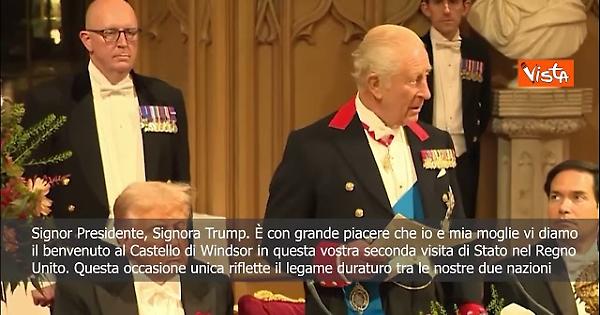 "Signor Presidente, Signora Trump. È con grande piacere che io e mia moglie vi diamo il benvenuto al Castello di Windsor, in questa vostra seconda visita di Stato nel Regno Unito. Questa occasione unica e importante riflette il legame duraturo tra le nostre due grandi nazioni, ancorato alla profonda amicizia tra i nostri popoli." Così Re Carlo III del Regno Unito, durante un banchetto di Stato con il Presidente degli Stati Uniti Donald Trump al Castello di Windsor.