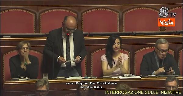 “L'abbiamo appreso pochi minuti fa, da un'anteprima di Piazza Pulita, nel settembre 2024, con la strage di Gaza ben in corso purtroppo da un anno, lei dichiarava, è un virgolettato, si dichiarava contrario ad ogni proposta di Stato palestinese. Allora Ministro io penso davvero che su questa cosa ci voglia una serietà, perché proprio l'ipocrisia davvero insopportabile dinanzi a quello che sta accadendo drammaticamente in quel territorio.” Così il deputato di Alleanza Verdi e Sinistra, Peppe De Cristofaro, durante il Question Time in Senato. / Senato