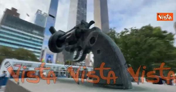 Le immagini della "pistola annodata", statua simbolo dell'Onu, posta davanti alla sede del Palazzo di Vetro a New York.