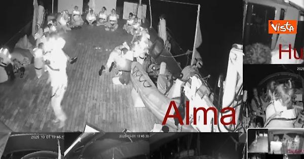 Ecco le immagini della videosorveglianza delle navid ella missione Flotilla, che in contemporanea trasmettono la diretta della navigazione. Sono iniziate le prime manovre di abbordaggio dei soldati israeliani.