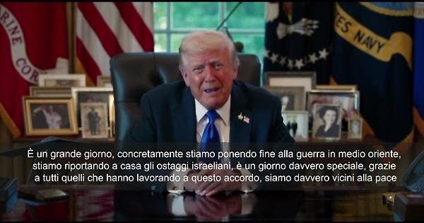 ”È un grande giorno, concretamente stiamo ponendo fine alla guerra in medio oriente, stiamo riportando a casa gli ostaggi israeliani, è un giorno davvero speciale, grazie a tutti quelli che hanno lavorando a questo accordo, siamo davvero vicini alla pace", così il Presidente Usa Donald Trump dopo che Hamas ha accettato il suo piano di pace per gaza.