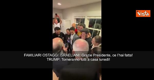 (Agenzia Vista) Usa, 09 ottobre 2025 Dopo l'annuncio dell'accordo raggiunto tra Israele e Hamas, Donald Trump ha chiamato le famiglie degli ostaggi israeliani che si trovavano a Washington promettendo che "gli ostaggi torneranno tutti lunedì". I familiari hanno ringraziato il Presidente per il lavoro diplomatico compiuto per liberare i 48 ostaggi, imprigionati dal 7 ottobre. X Fonte: Agenzia Vista / Alexander Jakhnagiev