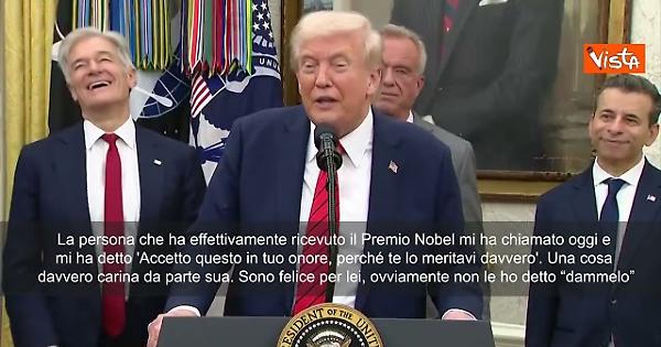 "La persona che ha effettivamente ricevuto il Premio Nobel mi ha chiamato oggi e mi ha detto 'Accetto questo in tuo onore, perché te lo meritavi davvero'. Una cosa davvero carina da parte sua. Sono felice per lei, ovviamente non le ho detto “dammelo”'." Lo ha detto Trump alla Casa Bianca.