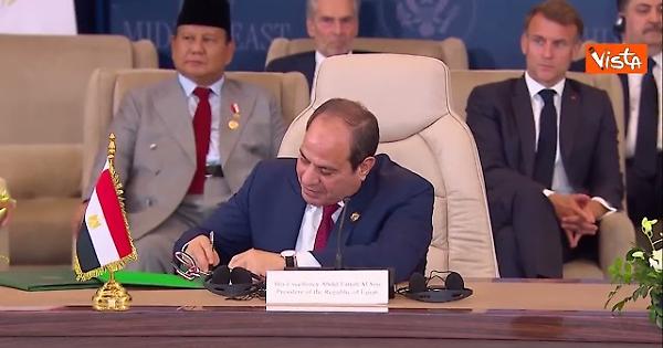 (Agenzia Vista) Egitto, 13 ottobre 2025 Donald Trump ha firmato l'accordo di pace per Gaza a Sharm el Sheik insieme al Presidente egiziano al Sisi, al Presidente turco Erdogan e al premier del Qatar Al Thani, tutti Paesi mediatori dell'accordo. Il pubblico ha tributato un applauso. Chigi Fonte: Agenzia Vista / Alexander Jakhnagiev