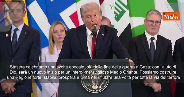 "La svolta epocale che siamo qui a celebrare stasera è più della fine della guerra a Gaza: con l'aiuto di Dio, sarà un nuovo inizio per un intero, meraviglioso Medio Oriente... possiamo costruire una regione forte, stabile, prospera e unita nel rifiutare una volta per tutte la via del terrore." Così Trump in Egitto.