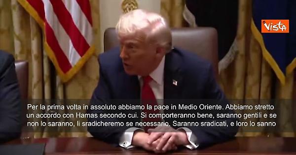 "Per la prima volta in assoluto abbiamo la pace in Medio Oriente. Abbiamo stretto un accordo con Hamas secondo cui. Si comporteranno bene, saranno gentili, e se non lo saranno, li sradicheremo se necessario. Saranno sradicati, e loro lo sanno". Così Trump parlando con i cronisti alla Casa Bianca.
