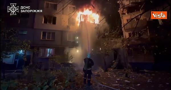 (Agenzia Vista) Kiev, 22 ottobre 2025 Palazzi in fiamme dopo l'impatto di un drone russo a Kharkiv. Colpito anche un asilo. Telegram Fonte: Agenzia Vista / Alexander Jakhnagiev