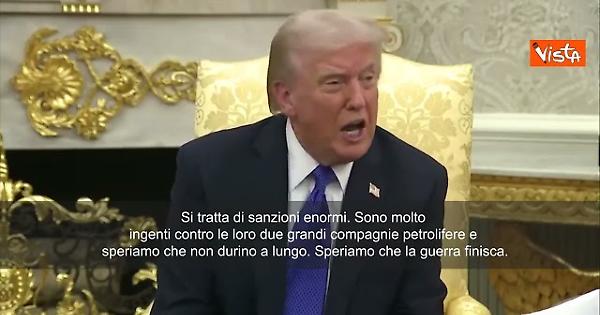 "Ho pensato che fosse il momento giusto per nuove sanzioni contro la Russia. Putin e Zelensky vogliono la pace". Spero che le enormi sanzioni contro la Russia durino poco". Lo ha detto Donald Trump in un bilaterale con il segretario generale della Nato nello Studio Ovale.