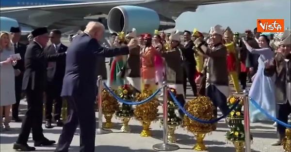 Il Presidente Usa Trump accolto all'aeroporto di Kuala Lumpur con danze tradizionali, lui risponde ballando a sua volta in risposta ai ballerini.