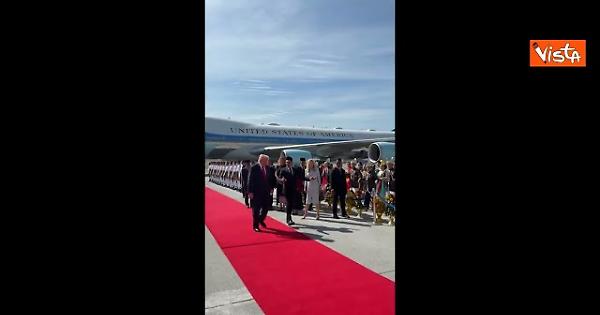 Trump in Malesia balla e sventola le bandiere all'arrivo all'aeroporto di Kuala Lumpur