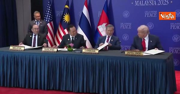 Il Presidente americano Donald Trump ha assistito alla firma di un accordo di cessate il fuoco tra Cambogia e Thailandia a Kuala Lumpur, in Malesia, dove è giunto oggi per partecipare al vertice dell'Associazione delle Nazioni del Sudest asiatico (Asean). L'accordo è stato firmato dal primo ministro della Cambogia, Hun Manet, e dal primo ministro della Thailandia, Anutin Charnvirakul. Si prevede che l'accordo rafforzerà la tregua raggiunta tre mesi fa a seguito dei colloqui tra i due Paesi. L'accordo firmato oggi viene presentato dalla Malesia, che detiene la presidenza di turno dell'Asean e ha svolto un ruolo chiave nei negoziati, come un accordo di cessate il fuoco, non come un accordo di pace.