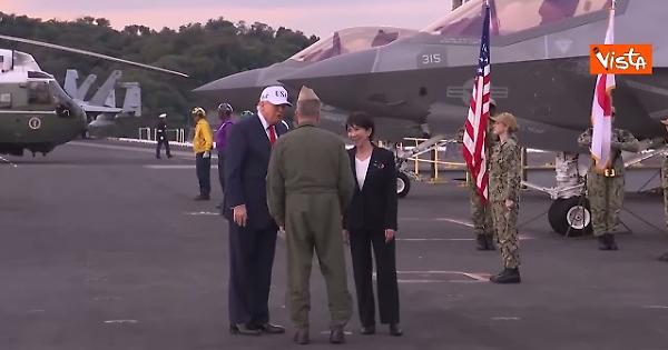 Il Presidente americano Donald Trump indossando un berretto bianco con la scritta Usa arriva con la premier giapponese Sanae Takaichi alla base navale di Yokosuka. I due leader sono stati accolti dagli onori militari.