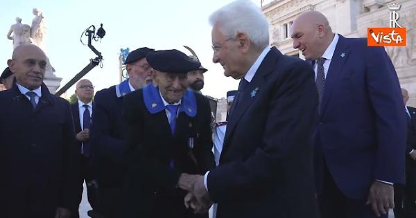 (Agenzia Vista) Roma, 04 novembre 2025 Al termine della deposizione della corona dall'oro al Milita Ignoto per la Festa delle Forze Armate, il Presidente della Repubblica Sergio Mattarella ha salutato i rappresentanti militari presenti, tra i quali anche il reduce di guerra Ivo Castellucci, che si è alzato in piedi per scattare una foto con il Capo dello Stato. Una curiosità, Ivo Castellucci nacque proprio il 4 novembre 1921, giorno della tumulazione del Milite Ignoto, e quindi oggi festeggia il suo 104esimo compleanno. Quirinale Fonte: Agenzia Vista / Alexander Jakhnagiev