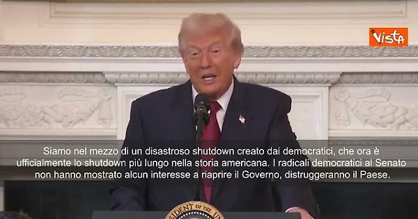 "Siamo nel mezzo di un disastroso shutdown creato dai democratici, che ora è ufficialmente lo shutdown più lungo nella storia americana. I radicali democratici al Senato non hanno mostrato alcun interesse a riaprire il Governo, distruggeranno il Paese", lo ha detto il Presidente Trump parlando ai senatori repubblicani alla Casa Bianca.