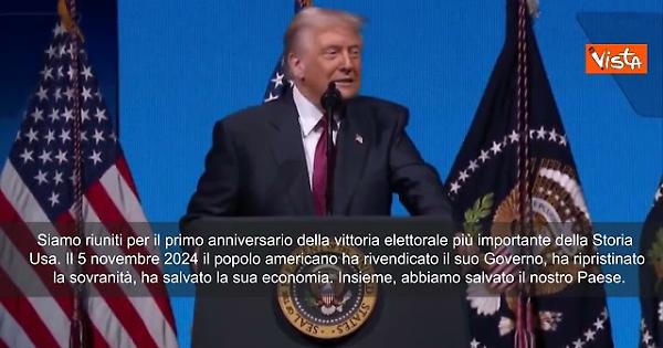 (Agenzia Vista) Usa, 05 novembre 2025 "Siamo riuniti per il primo anniversario della vittoria elettorale più importante della Storia Usa. Il 5 novembre 2024 il popolo americano ha rivendicato il suo Governo, ha ripristinato la sua sovranità, ha salvato la sua economia. E insieme, abbiamo salvato il nostro Paese". così il Presidente Donald Trump nel discorso ai sostenitori a un anno dall'elezione. X Fonte: Agenzia Vista / Alexander Jakhnagiev