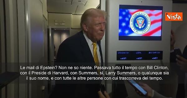 (Agenzia Vista) Usa, 15 novembre 2025 "Le mail di Epstein? Non ne so niente. Passava tutto il tempo con Bill Clinton, con il Preside di Harvard, con Summers, sì, Larry Summers, o qualunque sia il suo nome, e con tutte le altre persone con cui trascorreva del tempo. Jeffrey Epstein e io abbiamo avuto un pessimo rapporto per molti anni. Indagate su cosa sapeva riguardo a Bill Clinton, rispetto al Preside di Harvard, rispetto a tutte quelle persone che conosceva, incluso JP Morgan Chase". Così Trump parlando ai cronisti a bordo dell'Air Force One. X Fonte: Agenzia Vista / Alexander Jakhnagiev