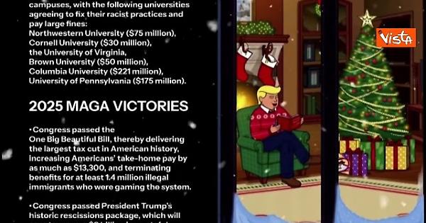 (Agenzia Vista) Usa, 22 dicembre 2025 Il video augurale per le festività natalizie della casa Bianca è strutturato come i trend di YouTube, con musica lo-fi in sottofondo, a tema natalizio, e un'immagine sempre uguale di Trump cartoon che legge un libro sotto l'Albero di Natale alla casa Bianca, con un maglione rosso. A fianco a lui scorrono i dati degli obiettivi raggiunti dai "Maga" nel 2025. WhiteHouse Fonte: Agenzia Vista / Alexander Jakhnagiev