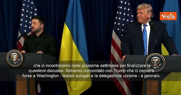 (Agenzia Vista) Usa, 28 dicembre 2025 "Innanzitutto grazie al Presidente Trump per la sua ospitalità qui a casa sua a Mar-a-Lago. Abbiamo avuto una telefonata produttiva congiunta con i leader europei, compresi Nato e Ue, e abbiamo concordato che ci incontreremo nelle prossime settimane per finalizzare le questioni discusse. Abbiamo concordato con Trump che ci ospiterà forse a Washington - leader europei e la delegazione ucraina - a gennaio. L'Ucraina è pronta alla pace. Siamo vicini all'intesa sul 90% dell'accordo, presto saranno definite le garanzie di sicurezza per l'Ucraina. Nelle prossime settimane arriveremo all'accordo finale". Lo ha detto Volodymyr Zelensky accanto a Donald Trump dopo il loro incontro a Mar-a-Lago WhiteHouse Fonte: Agenzia Vista / Alexander Jakhnagiev