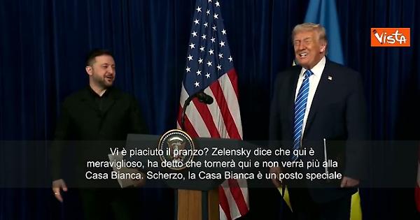 "Vi è piaciuto il pranzo? Zelensky dice che qui è meraviglioso, ha detto che tornerà qui e non verrà più alla Casa Bianca. Scherzo, la Casa Bianca è un posto speciale", lo ha detto Trump scherzando con i cronisti a Mar-a-Lago.