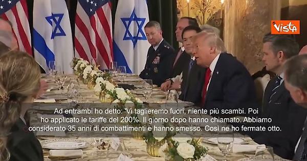 "Ad entrambi ho detto: 'Vi taglieremo fuori, niente più scambi. Poi ho applicato le tariffe del 200%. Il giorno dopo hanno chiamato. Abbiamo considerato 35 anni di combattimenti e hanno smesso. Così ne ho fermate otto. Ti racconterò il resto. Abbiamo già fatto molti progressi. Abbiamo avuto un incontro di circa cinque minuti e abbiamo già risolto tre delle difficoltà. Quindi grazie mille per essere qui. Sarò da voi fuori, c'è una bellissima giornata. Godetevi il pranzo”. Così il Presidente Usa Donald Trump, ripreso da un microfono acceso mentre si lamentava con il Primo ministro israeliano Benjamin Netanyahu per non essere riuscito a vincere il Premio Nobel per la pace nel 2025.