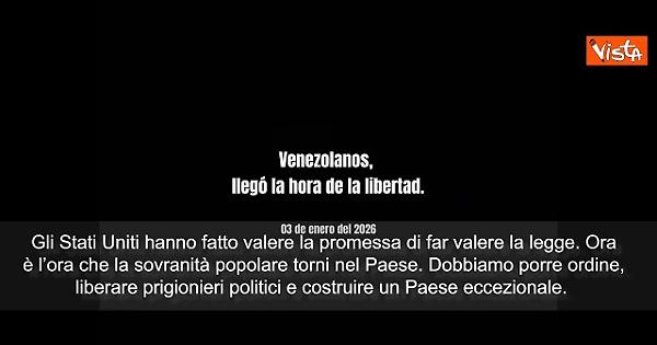 “Venezuelani, è arrivata l’ora della libertà. Nicolas Maduro è stato catturato dalla giustizia internazionale per i crimini atroci commessi contro i venezuelani e i cittadini di altre nazioni. Il Governo degli Stati Uniti ha fatto valere la promessa di far valere la legge. È arrivata l’ora della sovranità popolare torni nel nostro Paese. Dobbiamo porre ordine, liberare i prigionieri politici e costruire un Paese eccezionale per riportare i nostri figli a casa. Abbiamo aspettato per anni, ne è valsa la pena. Quello che doveva succede sta succedendo. Edmundo Gonzalez deve essere eletto legittimo Presidente del Venezuela”. Lo ha detto Maria Corina Machado, leader dell’opposizione in Venezuela e vincitrice del Premio Nobel per la Pace nel 2025.