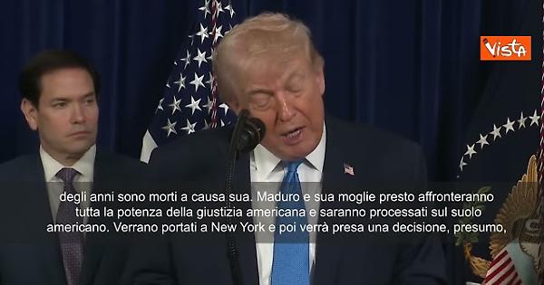 "Maduro ha supervisionato personalmente il feroce cartello noto come Cartel Deles Solless, che ha inondato la nostra nazione con un veleno letale responsabile della morte di innumerevoli americani. Centinaia di migliaia di americani nel corso degli anni sono morti a causa sua. Maduro e sua moglie presto affronteranno tutta la potenza della giustizia americana e saranno processati sul suolo americano. Verrano portati a New York e poi verrà presa una decisione, presumo, tra New York e Miami o la Florida. Le prove schiaccianti dei loro crimini saranno presentate in un tribunale. Ho visto quello che abbiamo contro di loro. È terribile e allo stesso tempo mozzafiato che qualcosa del genere possa essere potuto accadere. Per molti anni, dopo la scadenza del suo mandato come presidente del Venezuela, Maduro è rimasto al potere e ha condotto un’incessante campagna di violenza, terrore e sovversione contro gli Stati Uniti d’America, minacciando non solo i nostri Stati Uniti". Lo ha detto il Presidente americano Donald Trump nella conferenza stampa in Florida dopo l'arresto del Presidente venezuelano Nicolas Maduro.