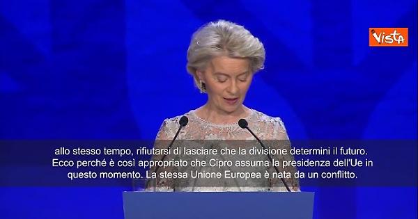 "Ci incontriamo in un paese in cui la promessa della riunificazione attende di essere mantenuta. Pochi luoghi nell'Unione Europea comprendono così chiaramente cosa significhi convivere con le conseguenze della divisione e, allo stesso tempo, rifiutarsi di lasciare che la divisione determini il futuro. Ecco perché è così appropriato che Cipro assuma la presidenza dell'Ue in questo momento. La stessa Unione Europea è nata da un conflitto. La nostra Unione non è perfetta, ma è una promessa: quella che la cooperazione è più forte dello scontro, che la legge è più forte della forza. Principi che valgono non solo per la nostra Unione europea, ma anche per la Groenlandia. Cipro apporta alla sua Presidenza un'autorità morale unica". Lo ha detto la presidente della Commissione Europea Ursula von der Leyen a Cipro.