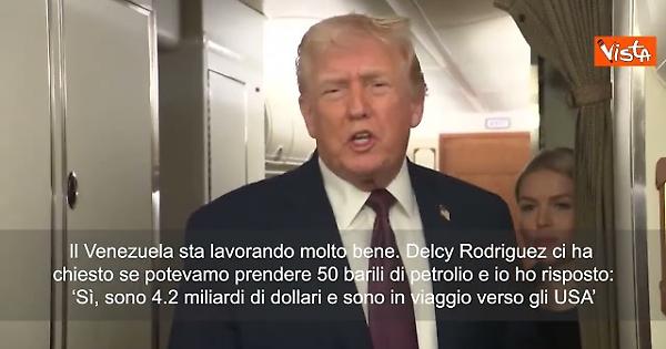 (Agenzia Vista) Washington DC, 11 gennaio 2026 “Il Venezuela sta lavorando molto bene. Delcy Rodriguez ci ha chiesto se potevamo prendere 50 barili di petrolio e io ho risposto: ‘Sì, sono 4.2 miliardi di dollari e sono in viaggio verso gli USA’”. Così Donald Trump ai cronisti presenti all’Air Force One. Courtesy: X Rapid Response 47 Fonte: Agenzia Vista / Alexander Jakhnagiev