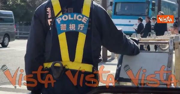 (Agenzia Vista) Tokyo, 16 gennaio 2026 La Polizia giapponese sposta le barriere mobili tradizionalmente a mano per far entrare le auto al Kantai, sede del Governo giapponese, in occasione della visita della premier Meloni. Fonte: Agenzia Vista / Alexander Jakhnagiev