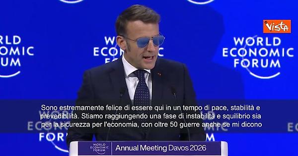 (Agenzia Vista) Davos, 20 gennaio 2026 “Sono estremamente felice di essere qui in un tempo di pace, stabilità e prevedibilità. Stiamo raggiungendo una fase di instabilità e squilibrio sia per la sicurezza per l'economia, con oltre 50 guerre anche se mi dicono che alcune sono risolte e un passaggio verso un mondo senza regole dove la legge internazionale è calpestata e le ambizioni imperiali tornano alla superficie. I nuovi dazi sono inaccettabili soprattutto se usati come leva contro la sovranità territoriale”. Così il presidente francese, Emmanuel Macron, ha ironizzato all'inizio del suo intervento al forum di Davos, in Svizzera. Wef Fonte: Agenzia Vista / Alexander Jakhnagiev